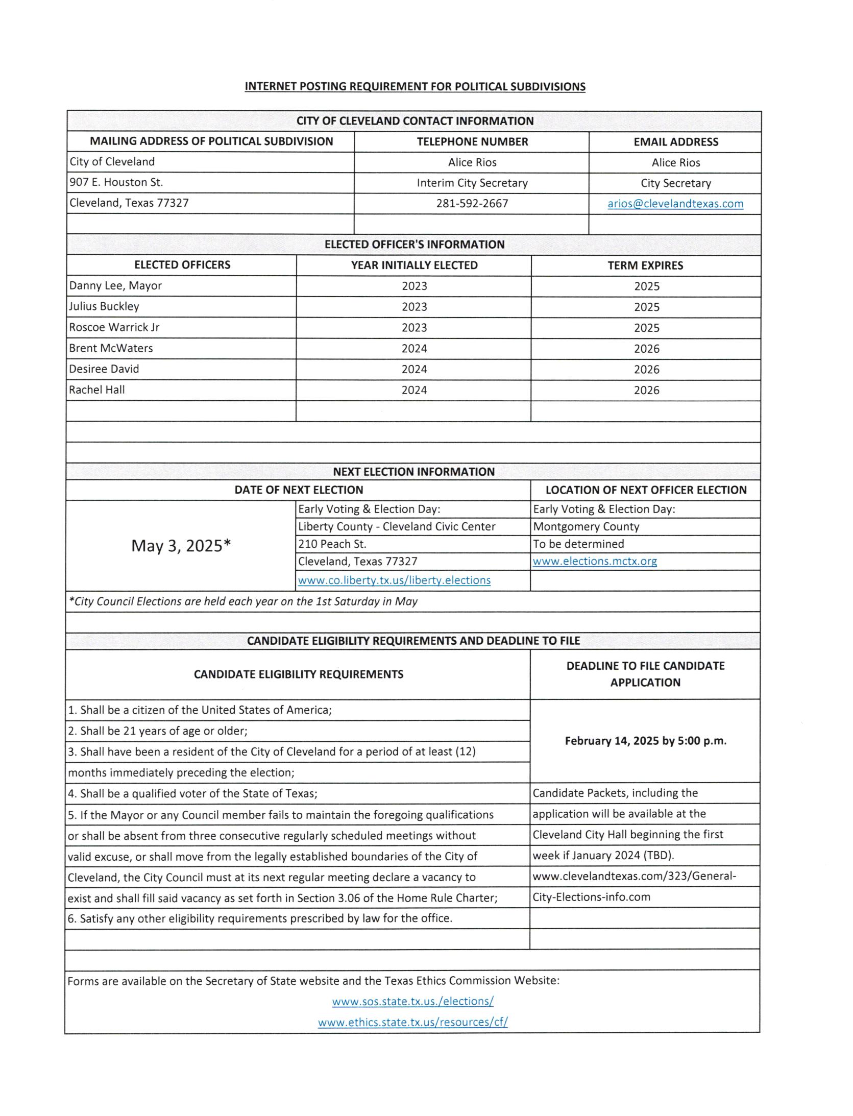The City of Cleveland General Election is held on the 1st Saturday in May of each year. The Mayor and each Council Person shall hold office for three(3) year terms.